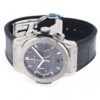 Hublot Classic Fusion Racing Grey Chronograph Titanium 45mm watch. Polished titanium case with brushed finished top and bottom center links between the lugs, Reference 521.NX.7071.LR. This model has Satin-finished Gray Sunray dial with a contrasting metallic silvered sub-dials. Polished, rhodium-plated hands indicate the time. Applied brushed finish Stainless Steel “applique” style index hour markers. Minute markers around the outer rim. Small-seconds sub-dial located at the 3 o’clock position. Chronograph/Stopwatch function: large central seconds counter with the “H” logo as a counter-weight; 30-minute sub-dial counter located at the 9 o’clock position. Polished titanium chronograph buttons. Date window located the 6 o’clock positions. Polished titanium crown with Pull / Press function. On it, the Hublot logo engraved on it. The dial closed by a Scratch-resistant Sapphire Crystal with Anti-reflective Treatment. Of Sapphire Crystal made transparent case back. The watch is equipped fixed titanium bezel with brushed finished top and polished finished beveled edges, secured with 6 polished “H” style Titanium screws. Black composite resin “bezel lug” sandwiched between the bezel and case. The watch is self-winding mechanical Hublot Caliber HUB1143, contains 59 Jewels and has an approximate power reserve of 42 hours. This model presented on a Gray Alligator/Crocodile Leather Strap with Lining of Black rubber stiched with Stainless Steel Deployant Buckle Clasp. The water resistance is up to 50m/150ft (5 ATM).
