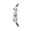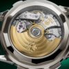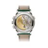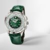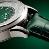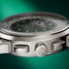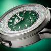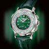 Luxury Patek Philippe Complication World-Time flyback chronograph, Platinum as attested by the diamond between the lugs at 6 o’clock, 39,5mm and Reference 5930P-001. Classicism and boldness. The highlight of this model is say it trendy, vibrant green dial. The circular guilloché pattern, applied by hand, is extremely refined and deservedly does not go unnoticed. Look good on dial applied 18k White Gold index hour markers with luminescent coating. The central Dauphine-style hour and minute hands are paired with a chronograph seconds hand. In the lower half of the green centre section, there is a 30-minute chronograph counter. Moving outward one-step, we find a two-tone day/night and 24-hour ring. Nestled in between that ring, and the outer city ring is the black on white chronograph-seconds track. Lastly, the outer ring shows all 24 time zones with corresponding cities, printed in green. It shows the time at a glance in all 24 time zones at any given moment. To change time zones, simply press the pusher at 10 o’clock and all displays will be simultaneously corrected.  Polished Screw-down Platinum crown that with ribbed edge for comfortable grip and logo Patek Philippe with for the flyback chronograph Platinum buttons are located on the right side of the case. The dial closed by a Scratch-resistant Sapphire Crystal and sapphire-crystal case back which allows of the case, allows you to see the magical work of the movement. The watch is equipped fixed polished Platinum bezel. The watch Patek Philippe Caliber СР28‑520 HU Self-winding mechanical movement, containing 38 Jewels, and has a power reserve of min. 50 hours – max. 55 hours. This model presented on shiny bottle green Alligator leather strap with square scales, hand-stitched and a platinum Fold-over clasp. The water resistance is up to 30m/100ft (3 ATM).