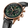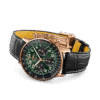 Unworn watch Breitling Navitimer B12 Chronograph 41 Cosmonaute, Reference RB12302A1L1P1 – it’s not just a watch; it is a testament to precision engineering, luxury and timeless elegance. Crafted with meticulous attention to detail, they combine sophistication and functionality. At first glance, the elegant 41mm 18k Red Gold case strikes the eye, striking the perfect balance between classic and modern. The 24-hour Green dial, Rose Gold-colored hour and minute hands with luminous fill, large Arabic numerals as hour markers ensure high readability even in poor visibility. Impressive are the AOPA wings, symbol of the Aircraft Owners and Pilots Association, the largest pilots’ club in the world, which in the 1950s chose the Navitimer as its official watch at 12 o’clock. The intricate workings of the watch are demonstrated by a chronograph, which includes the elegant red central second hand; black sub-dial for 30-minute counter at 3 o’clock; black 12-hour counter subdial at 6 o’clock. While the iconic circular slide rule adds, a touch of aviation heritage. The watch also has a second’s subdial at 9 o’clock and a date indicator at 6 o’clock. The dial is covered with a domed scratch-resistant sapphire crystal with anti-reflective coating on both sides. The transparent sapphire crystal case back reveals the mesmerizing operation of the movement. The dial is framed by a signature bi-directional fluted 18k Red Gold bezel with a scalloped profile for easy grip. A masterpiece of engineering, Breitling’s in-house Caliber 12 contains 47 jewels and has an approximate power reserve of 70 hours, ensuring exceptional precision, allowing you to conquer every moment with unwavering precision. The watch presented on the Black Alligator leather strap with 18k Red Gold l Folding Clasp. The water resistance is up to 30m/99ft (3 ATM).