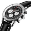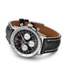 Breitling Navitimer 1 B01 Chronograph Men’s Watch 43mm in polished finished stainless steel case, Reference AB0121211B1X2. This model has black dial with silver dial flange and silver subdials. Applied polished index hour markers with luminous tips. Fine printed minutes/seconds and fraction-of-a-second track. Slide rule aka “navigation computer” around the outer rim. Polished hands, the hour and minutes hands with luminous fill. Small running seconds sub-dial located at the 9 o’clock position. Date window located between the 4 and 5 o’clock position. Chronograph/Stopwatch functions: large central red seconds hand counter, capable of keeping time up to 1/4th of a second; 30-minute sub-dial counter located at the 3 o’clock position; 12-hour counter sub-dial located at the 6 o’clock position. Stainless steel crown with a non-slip grip as well as non-screw-locked with two gaskets. The dial closed by a convex Scratch-Resistant sapphire crystal, glare-proofed both sides. The screw-down case back is also made of sapphire crystal. The watch is equipped polished stainless steel Slide-Rule bi-directional rotating bezel. The Slide-Rule aka Navigation-Computer complication computes airborne calculations such as fuel consumption, climbing times and converts miles into nautical miles or kilometers. The watch is self-winding mechanical in house caliber B01 contains 47 jewels and has an approximate power reserve of 70 hours. This model presented on a Black Calfskin Leather strap Navitimer with Push Button Deployant Buckle. The water resistance is up to 30m/99ft (3 ATM).