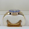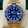 Rolex Submariner Date, 41mm watch of polished 18k Yellow Gold. This model has blue dial with a polished 18k Yellow Gold hour, minute and seconds hands in Mercedes-logo and Breguet-style sword shape with luminous fill. Applied polished 18kt Yellow Gold rimmed doty and index hour markers with luminous fill. Fine printed minute/seconds track on the dial rim. Highly legible Chromalight display with long-lasting blue luminescence. Polished 18kt Yellow Gold patented “Triplock” locking crown ensuring that the crown screws down onto the Oyster case as securely as a submarine hatch. The dial closed by a Scratch-resistant Sapphire Crystal and solid case back made. The Watch has Centre hour minute and seconds hands. Stop-seconds for precise time setting. Date window at 3 o’clock with a cyclops magnifier. The watch is equipped unidirectional rotatable polished 18k Yellow Gold bezel with knurled corners for enhanced grip. Blue “Cerachrom” bezel insert, made of ceramic which is extremely hard, durable and highly scratch-resistant. Ceramic has excellent corrosion resistant properties and is unaffected by ultraviolet rays so the color will not fade. It features a 60-minute immersion scale engraved in yellow gold with a luminous point at the origin. The movement is mechanical self-winding 3235, containing 31 Jewels and 70 hours of power reserve. The 18k Yellow Gold Rolex Oyster bracelet of brushed outer links and polished center links with folding Oysterlock safety clasp with Rolex Glidelock extension system. The water resistance is up to 300 meters/1000 feet.Â