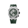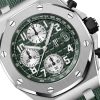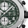 Unworn Audemars Piguet Royal Oak Offshore SELFWINDING CHRONOGRAPH 26238TI.OO.A056CA.01. 42 mm, Khaki green dial with “Mega Tapisserie†pattern, silver-toned counters, arabic numerals hour-markers and white gold Royal Oak hands with luminescent coating, khaki green inner bezel, Titanium case and bezel, glareproofed sapphire crystal and caseback, black rubber pushpieces and screw-locked crown, titanium pushpiece guards, 4404 calibre, Selfwinding movement, 70 h power reserve, 40 jewels,  Khaki green rubber strap with AP folding clasp. Water resistant to 100 m.