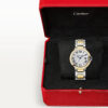 Cartier Ballon Bleu 36mm Two-Tone Automatic Bracelet Watch W2BB0038. Stainless steel & 18ct yellow gold 36mm case and bezel all on a matching two-tone bracelet. This watch has a silver guilloche dial with blued steel hands, black roman numerals and date display at the 3 o’clock position. Sapphire crystal glass and water resistant up to 30m. Automatic movement.