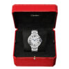 This 40mm Ballon Bleu de Cartier watch for men is an elegant and understated design crafted from stainless steel. Its balloon-inspired case is home to a mechanical self-winding movement that provides a 42-hour power reserve. The 1847 MC engine performs at a rate of 28,800 vibrations per hour whilst secured firmly inside a 30-meter water resistant protective housing. Nestled safely inside the shape of the bezel itself, is a blue synthetic cabochon spinel-adorned crown at 3 o’clock, paired with a date aperture on the watch’s silvered guilloche dial. The display of this Ballon Bleu de Cartier watch also Features crisp black Roman numeral hour markers and blued steel hands shaped into the instantly recognisable sword shape. The model is completed on an interchangeable stainless steel link bracelet that secures comfortably to the wrist with a Cartier-engraved folding clasp.