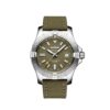 Breitling Avenger Automatic GMT. Black dial 43 mm Stainless Steel case. Unidirectional ratcheted bezel, Cambered sapphire, glareproofed both sides crystal. Breitling 32 calibre, Self-winding mechanical, 2nd timezone (24 hr), 42 hrs power reserve, 21 jewels. Calfskin Leather strap Tang-type clasp. Water resistance 300 m (1,000 ft).