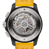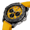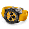 Bold, extremely robust and shock resistant watch, the Breitling Avenger B01 Chronograph 44 Night Mission, Reference SB0147101I1X1, from Ceramic case combine precision, durability and powerful design. The model has Yellow dial with black sub-dials and black dial flange with specific Arabic numerals recall the stenciled numbers used on the decks of aircraft carriers. Printed white minute markers around the outer rim tracks with Arabic numerals marking every 15-minutes interval. Polished hour and minute hands with luminous fill. Small seconds counter located at the 9 o’clock position. Date window located at the 6 o’clock position. Chronograph/stopwatch functions: large central second’s hand featuring a red arrowhead tip and luminous fill. Capable of counting time up to 1/4th of a second; 30-minute counter sub-dial located at the 3 o’clock position; 12-hour counter located at the 6 o’clock position. The watch has Ceramic screw-down crown and chronograph pushers of with a special grip-pattern for a comfortable grip. On the crown printed Logo Breitling. The dial closed by a sapphire crystal, glare-proofed both sides. The screwed solid case back. The watch is equipped unidirectional-ratcheted rotating Black Ceramic bezel with engraved Arabic numerals, indexes and large dot at the origin. The Watch comes with Breitling 01 automatic chronograph movement, which beats at 28,800 vph, contains 45 jewels, and has an approximate power reserve of 70 hours. The watch presented on a Yellow calfskin leather strap with Titanium Folding clasp. The water resistance is up to 300m/1000ft.