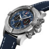 Breitling Avenger B01 Chronograph. Black dial 45 mm Stainless Steel case. Unidirectional, ratcheted bezel, Cambered sapphire, glareproofed both sides crystal. Breitling 01 (Manufacture) calibre, self-winding mechanical, 70 hrs power reserve, 47 jewels. Calfskin Leather strap Tang-type clasp. Water resistance 300 m (1,000 ft).