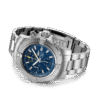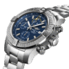 Breitling Avenger Chronograph Automatic watch, 45mm, stainless steel case. Blue dial with applied steel index hour markers with luminous fill. Printed white minute, seconds & fractions of a second tracks. Hour and minute hands with luminous fill. 1/100th second markers around the outer rim. Chronograph/stopwatch functions: large central second’s hand featuring a yellow arrowhead tip & luminous fill. Capable of counting time up to 1/4th of a second; 30-minute counter with yellow highlights located at the 12 o’clock position; 12-hour counter located at the 6 o’clock position. Small seconds counter located at the 9 o’clock position. Date window located at the 3 o’clock position. Stainless steel screw-down crown with a non-slip grip. The dial closed by a convex sapphire crystal, glare-proofed both sides. Unidirectional rotating silver-tone brushed/satin finished stainless steel bezel with engraved Arabic numerals and indexes. The Watch comes with Breitling COSC Certified Caliber 13 automatic chronograph movement, which beats at 28,800 vph, contains 25 jewels, and has an approximate power reserve of 42 hours. The watch presented on a Stainless Steel Straight bracelet with Fold over clasp with a safety release. The water resistance is up to 300m/1000ft.