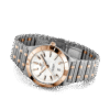 Unworn Ladies watch Breitling Chronomat 32, case brushed and polished Stainless Steel and 8k Red Gold, Reference U77310101A2U1 a unique watch that harmoniously combines functionality with style. Crafted with meticulous attention to detail, they have an impeccable Mother-of-pearl dial, which is decorated with 18k Red Gold a “B” emblem below the 12 o’clock position. Perfect hour markers made of polished 18k Red Gold with 11 crystal clear diamonds instead of luminous dots fill the dial with special luxury. Polished 18k Red Gold hands with luminous filling ensure high readability even in the dark. The slender seconds hand has a special design, having an arrowhead with luminescent filling and the manufacturer’s logo “B†on the other side. Along the outer perimeter of the dial is a finely printed minute/second track with Arabic numerals every 5 minutes. Date window located at the 6 o’clock position. The dial closed by a Cambered Scratch-resistant Sapphire Crystal with glare-proofed both sides. A screw-on, durable case back securely covers the watch mechanism. The non-screw-lock crown is made of polished 18k Red Gold with two gaskets, has a ribbed edge for easy grip, and features the Breitling logo on the end. The watch features a polished 18k Red Gold unidirectional rotating bezel with a ratcheting mechanism, a large luminous dot at the origin, and brushed 1/4-hour inlays. The Model comes with Breitling Caliber 77 SuperQuartzâ„¢, thermocompensated quartz electronic, EOL indicator. The watch presented on the Featuring Breitling’s iconic and comfortable “Rouleaux†bracelet of brushed and polished Stainless Steel and 18k Red Gold with a Stainless Steel Folding Clasp. The water resistance is up to 100m/330ft.