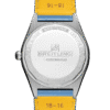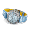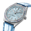 Unworn Ladies watch Breitling Chronomat Automatic 36 South Sea, case brushed and polished Stainless Steel and 18k White Gold, Diamonds and Gem, Reference G10380611C1P1. Meticulously crafted to embody elegance and functionality, this timepiece exudes a timeless charm that captivates the discerning eye. Crafted with meticulous attention to detail, they have an impeccable Ice blue dial with a fine sunray finish, which is decorated with a 18k White Gold «B” emblem below the 12 o’clock position. Perfect hour markers made of polished 18k White Gold with crystal clear diamonds instead of luminous dots fill the dial with special luxury. Polished 18k White Gold hands with luminous filling ensure high readability even in the dark. The slender 18k White Gold seconds hand has a special design, having an arrowhead with luminescent filling and the manufacturer’s logo “B†on the other side. Along the outer perimeter of the dial is a finely printed minute/second track with Arabic numerals every 5 minutes. Date window located at the 6 o’clock position. The dial closed by a Cambered Scratch-resistant Sapphire Crystal with glare-proofed both sides. A screw-on, durable case back securely covers the watch mechanism. The non-screw-lock crown with two gaskets, has a ribbed edge for easy grip, and features the Breitling logo on the end. The watch features a polished 18k White Gold bezel with a Gemstone-Set. The Model comes with Breitling Caliber 10 contains 25 Jewels and has an approximate power reserve of 42 hours. She is presented on Breitling’s iconic and comfortable Blue alligator leather strap with contrasting off-white stitching, which fastens on Stainless Steel Folding Clasp. The water resistance is up to 100m/330ft.