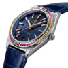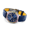 Unworn Ladies watch Breitling Chronomat Automatic 36 South Sea, case brushed and polished Stainless Steel, Diamonds and Gem, Reference A10380611C1P1. Meticulously crafted to embody elegance and functionality, this timepiece exudes a timeless charm that captivates the discerning eye. Crafted with meticulous attention to detail, they have an impeccable Midnight blue dial with a fine sunray finish, which is decorated with an 18k Red Gold «B” emblem below the 12 o’clock position. Perfect hour markers made of polished 18k Red Gold with crystal clear diamonds instead of luminous dots fill the dial with special luxury. Polished 18k Red Gold hands with luminous filling ensure high readability even in the dark. The slender 18k Red Gold seconds hand has a special design, having an arrowhead with luminescent filling and the manufacturer’s logo “B†on the other side. Along the outer perimeter of the dial is a finely printed minute/second track with Arabic numerals every 5 minutes. Date window located at the 6 o’clock position. The dial closed by a Cambered Scratch-resistant Sapphire Crystal with glare-proofed both sides. A screw-on, durable case back securely covers the watch mechanism. The polished Stainless Steel Non Screw-locked “onion†crown with two gaskets, a classic Chronomat feature named for its fluted-dome shape allows for easy adjustments. On its end there is Breitling logo is applied. The charming bezel made of polished stainless steel and decorated with precious stones gives the watch a special chic. The Model comes with Breitling Caliber 10 contains 25 Jewels and has an approximate power reserve of 42 hours. She is presented on Breitling’s iconic and comfortable Blue alligator leather strap with contrasting off-white stitching, which fastens on Stainless Steel Folding Clasp. The water resistance is up to 100m/330ft.
