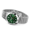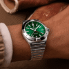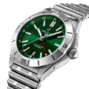 Unworn watch Breitling Chronomat Automatic GMT 40, brushed and polished Stainless Steel case, reference A32398101L1A1, is a timepiece that harmoniously combines precision engineering with timeless elegance. Crafted with meticulous attention to detail, they feature a sleek 40mm stainless steel case that combines sophistication and durability. Green dial with a fine sunray finish, which is decorated with a silver «B” emblem below the 12 o’clock position. This model features silver polished hour markers and hands that glow in the dark thanks to luminescent filling. They are harmoniously complemented by a thin silver second’s hand of a special design, which has a hand with luminescent filling and the manufacturer’s logo “B†on the other side. Date window located at the 6 o’clock position. The watch is powered by Breitling’s Caliber 32 automatic movement, which contains 21 jewels and has an approximate power reserve of 42 hours, making it possible to not only keep impeccable time, but also has a convenient GMT function that allows you to easily track multiple time zones. GMT/2nd Time Zone Function: the central Red hand indicates GMT/Dual Time zone with the luminous arrowhead tip pointing to the 24 hour indications on the dial flange; the GMT hour hand makes a single revolution once in 24 hours. The dial closed by a Cambered Scratch-resistant Sapphire Crystal with glare-proofed both sides. A screw-on, durable Stainless Steel case back securely covers the watch mechanism. The Screw-locked “onion†crown with two gaskets, a classic Chronomat feature named for its fluted-dome shape allows for easy adjustments. On end there is Breitling logo is applied. The watch features a polished Stainless Steel unidirectional rotating bezel with a ratcheting mechanism, a large luminous dot at the origin, and brushed raises in position 15, 30, 45 minute. The watch presented on the Featuring Breitling’s iconic and comfortable Rouleaux style Bracelet, which fastens Stainless steel Folding Clasp. The water resistance is up to 200m/660ft.