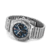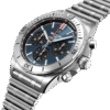Breitling Chronomat B01 42 watch, case brushed and polished Stainless Steel, Reference AB0134101C1A1. The model has blue dial with black sub-dials and “B” emblem below the 12 o’clock position. This watch applied polished index hour markers with luminous fill and polished hands with luminous fill. Black dial flange with Tachymeter scale and fine printed minute/seconds track intervals on the outer perimeter dial. Date window located at the 6 o’clock position. Small seconds sub-dial at 9 o’clock. The dial closed by a Cambered Scratch-resistant Sapphire Crystal with glare-proofed both sides. Of Sapphire Crystal made transparent case back. The watch has polished Stainless Steel screw-locked crown with two gaskets. The crown has a ribbed edge for a comfortable grip. Â On its end there is Breitling logo is applied. Chronograph/Stopwatch functions: column wheel mechanism; large red central seconds counter hand; 30-minute counter sub-dial located at the 3 o’clock position; 12-hour counter sub-dial at the 6 o’clock position. On the right side case also houses the Stainless Steel chronograph buttons a cylindrical shape. The watch is equipped polished Stainless Steel unidirectional-ratcheted rotating bezel ring with brushed finished 1/4 hour rider tabs. The Model comes with Breitling Caliber B01 contains 47 Jewels and has an approximate power reserve of 70 hours. The watch presented on the Rouleaux Bracelet brushed and polished Stainless Steel with Push Button Folding Clasp. The water resistance is up to 200m/660ft.