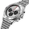 Unworn Breitling Men’s Watch Chronomat B01 42, brushed and polished finished Stainless steel case, Reference AB0134101G1A1. This model has Silver dial with black sub-dials and black dial flange with Tachymeter scale around the outer rim. Applied polished index hour markers with luminous fill. The silver-tone polished Stainless Steel minute and hour hands with luminous filled tops. Fine printed minute/seconds and fractions of a seconds track. The watch has polished Stainless steel non-screw-locked crown with two gaskets with ribbed edge for a comfortable grip also Breitling logo and round chronograph pushers. The dial closed by a Cambered Scratch-resistant Sapphire Crystal with glare-proofed both sides. Of Sapphire Crystal made transparent case back. Date window at 6 o’clock. Small seconds-hand sub-dial located at the 9 o’clock position. Chronograph functions: column wheel mechanism; large red central seconds counter hand; 30-minutes counter sub-dial located at the 3 o’clock position; 12-hour counter sub-dial at the 6 o’clock position. The watch is equipped unidirectional, ratcheted polished Stainless Steel bezel ring with brushed finished stainless steel 1/4 hour rider tabs. . The watch is Breitling in-house caliber B01, contains 47 jewels and has an approximate power reserve of 70 hours. The watch presented on a brushed and polished Stainless Steel Rouleaux bracelet with Stainless Steel Push Button Folding Clasp. The water resistance is up to 200m/660ft.