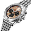 Unworn Breitling Men’s Watch Chronomat B01 42, brushed and polished finished Stainless steel case, Reference AB0134101K1A1. This model has Copper colored dial with black sub-dials and black dial flange with Tachymeter scale around the outer rim. Applied polished index hour markers with luminous fill. The silver-tone polished Stainless Steel minute and hour hands with luminous filled tops. Fine printed minute/seconds and fractions of a seconds track. The watch has polished Stainless steel non-screw-locked crown with two gaskets with ribbed edge for a comfortable grip also Breitling logo and round chronograph pushers. The dial closed by a Cambered Scratch-resistant Sapphire Crystal with glare-proofed both sides. Of Sapphire Crystal made transparent case back. Date window at 6 o’clock. Small seconds-hand sub-dial located at the 9 o’clock position. Chronograph functions: column wheel mechanism; large red central seconds counter hand; 30-minutes counter sub-dial located at the 3 o’clock position; 12-hour counter sub-dial at the 6 o’clock position. The watch is equipped unidirectional, ratcheted polished Stainless Steel bezel ring with brushed finished stainless steel 1/4 hour rider tabs. The watch is Breitling in-house caliber B01, contains 47 jewels and has an approximate power reserve of 70 hours. The watch presented on a brushed and polished Stainless Steel Rouleaux bracelet with Stainless Steel Push Button Folding Clasp. The water resistance is up to 200m/660ft.