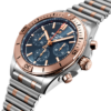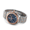 Breitling Chronomat B01 42 watch, case brushed and polished stainless steel and 18k Red Gold, Reference UB0134101C1U1. The model has blue dial with blue sub-dials and an 18k Red Gold “B” emblem below the 12 o’clock position. This watch applied polished 18k Red Gold index hour markers with luminous fill and polished 18k Red Gold hands with luminous fill. Blue dial flange with Tachymeter scale and fine printed minute/seconds track intervals on the outer perimeter dial. Date window located at the 6 o’clock position. Small seconds sub-dial at 9 o’clock. The dial closed by a Cambered Scratch-resistant Sapphire Crystal with glare-proofed both sides. Of Sapphire Crystal made transparent case back. The watch has polished 18k Red Gold screw-locked crown with two gaskets. The crown has a ribbed edge for a comfortable grip and Breitling logo. On the right side case also houses the 18k Red Gold chronograph buttons a cylindrical shape. Chronograph/Stopwatch functions: column wheel mechanism; large red central seconds counter hand; 30-minute counter sub-dial located at the 3 o’clock position; 12-hour counter sub-dial at the 6 o’clock position. The watch is equipped polished 18k Red Gold unidirectional-ratcheted rotating bezel ring with brushed finished 1/4 hour rider tabs. The Model comes with Breitling Caliber B01 contains 47 Jewels and has an approximate power reserve of 70 hours. The watch presented on the Rouleaux Bracelet brushed and polished Stainless Steel with 18k Red Gold links with Push Button Folding Clasp. The water resistance is up to 200m/660ft.