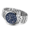 Unworn Breitling Men’s Watch Classic AVI B04 Chronograph GMT 46 Tribute to Vought F4U Corsair, brushed and polished Stainless Steel, 46mm, Reference AB04451A1C1A1. Crafted with meticulous attention to detail and inspired by iconic aviation instrument design, this masterpiece seamlessly combines sophistication and functionality. The model features a Blue main dial and Blue sub-dials, which is decorated with a Silver-tone “B†emblem below the 12 o’clock position, create a striking union. The watch features the same Arabic numerals as hour markers as the original 1953 Co-Pilot models. The Silver-tone polished hour and minute hands have luminescent filling and provide excellent legibility even in poor lighting. The elegant Silver central seconds hand with a luminescent filling looks harmonious. Along the outer contour, there is a minute scale with luminous indices that appear every 5 minutes. Along with unparalleled precision and sophistication, these iconic watches are highly functional. She implemented due to the presence of an additional seconds dial at the 9 o’clock position, GMT/Dual Time Zone and a chronograph. It performs the following functions: column wheel mechanism; large central seconds hand counter, capable of keeping time up to 1/4th of a second; 30-minute sub-dial counter located at the 3 o’clock position; 12-hour counter sub-dial located at the 6 o’clock position. GMT/Dual Time Zone includes blue dial flange with 24-hour indications and Black central arrow with glowing red arrow, which makes a single rotation every 24 hours and points to the desired additional time zone. The watch has polished Stainless steel screw-locked crown with two gaskets. The crown has a ribbed edge for a comfortable grip and Breitling logo. On the right side case, also houses the chronograph Stainless Steel buttons a cylindrical shape. The dial closed by a Scratch Resistant Sapphire crystal. The transparent sapphire crystal case back reveals the mesmerizing operation of the movement. The watch is equipped Stainless Steel bidirectional ratcheted rotating fluted bezel and labels in the form of Arabic numerals from 1 to 11 with a triangle at the origin. Breitling in house caliber B04 contains 47 jewels and has an approximate power reserve of 70 hours. The watch presented on a Brushed and polished Stainless Steel Bracelet of five links with Stainless Steel Deployant Clasp. The water resistance is up to 100m/330Ft.