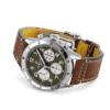 Unworn Breitling Men’s Watch Classic AVI Chronograph 42 Curtiss Warhawk brushed and polished Stainless Steel, 42mm, Reference A233802A1L1X1. Crafted with meticulous attention to detail and inspired by iconic aviation instrument design, this masterpiece seamlessly combines sophistication and functionality. The model features a Green main dial and Silver sub-dials, which is decorated with a Silver-tone “B†emblem below the 12 o’clock position, create a striking union. The watch features the same Arabic numerals as hour markers as the original 1953 Co-Pilot models. The Super-LumiNova color is reminiscent of the original luminescent material and gives the model a vintage charm. The Silver-tone polished syringe-shaped hour and minute hands have luminescent filling and provide excellent legibility even in poor lighting. The elegant Silver-tone central seconds hand with a red tip looks harmonious. Along the outer contour, there is a minute scale with luminous indices that appear every 5 minutes. Along with unparalleled precision and sophistication, these iconic watches are highly functional. She implemented due to the presence of an additional seconds dial at the 9 o’clock position and a chronograph. It performs the following functions: column wheel mechanism; large central seconds hand counter, capable of keeping time up to 1/4th of a second; 30-minute sub-dial counter located at the 3 o’clock position; 12-hour counter sub-dial located at the 6 o’clock position. The watch has polished Stainless steel screw-locked crown with two gaskets. The crown has a ribbed edge for a comfortable grip and Breitling logo. On the right side case, also houses the chronograph Stainless Steel buttons a cylindrical shape. The dial closed by a Scratch Resistant Sapphire crystal. The watch has Stainless Steel Screwed Solid case back. The watch is equipped Stainless Steel bidirectional rotating fluted bezel is with labels in the form of Arabic numerals from 1 to 11 and a triangle at the origin. Breitling in house caliber B23 contains 27 jewels and has an approximate power reserve of 48 hours. The watch presented on a Brown Calfskin Leather Strap on Yellow lining with Stainless Steel Folding clasp. The water resistance is up to 100m/330Ft.