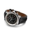 Breitling Navitimer 1 Chronograph GMT 46 watch, 46mm, polished stainless steel case, Reference A24322121B2X1. This model has Black dial with polished silver-tone steel hour and minute’s hands with luminous fill. Applied polished index hour markers with painted luminous segments at the tips. Fine printed minutes/seconds and fraction-of-a-second track. Small running seconds sub-dial located at the 9 o’clock position. Date window located the 3 o’clock positions. Non Screw-locked polished Stainless steel crown with a non-slip grip, two gaskets and logo Breitling. The dial closed by a Convex Scratch-Resistant sapphire crystal, glare-proofed both sides. The screwed case back is also made of sapphire crystal. Chronograph/Stopwatch functions: large central red tipped seconds counter; 30-minute sub-dial counter located at the 12 o’clock position; 12-hour counter sub-dial located at the 6 o’clock position. GMT/2nd Time Zone: indicated by an additional red arrowhead tipped hour hand; The GMT hour hand make a single full revolution every 24 hours (moving at the half the pace of the regular hour hand). This hand points to the gold-toned 24-hour indications printed on the dial perimeter; the 24- hour’s indications are printed in Arabic numerals for the even hours, bold indexes for the odd hours and lighter indexes for the half hour markings. The watch is equipped bidirectional rotating Stainless Steel bezel with “Slide Rule” aka “Navigation Computer”. It allows computing different airborne calculations such as fuel consumption, climbing times & converting miles into nautical miles or kilometers. The watch is self-winding mechanical Breitling in-house Caliber 24, contains 25 Jewels and has a minimum power reserve of 48 hours. This model presented on a Black Calfskin Leather strap with Tang Buckle Clasp. The water resistance is up to 30m/99ft.