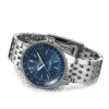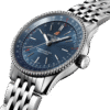 Breitling Navitimer Automatic 35 Ladies Watch, 35mm, polished Stainless Steel case, Reference A17395161C1A1. This model has Blue dial with a fine sunray finish and Tachymeter scale on dial flange. Recognizable  Rose Gold tone “B” emblem below the 12 o’clock position. Attract attention polished luminous silver-tone hour and minute hands with Red-tipped seconds hand. On dial applied polished index hour markers. On the outer edge of the dial, there is a Navitimer scale with minutes and seconds in small print. The watch has Stainless steel Pull / push non screw-locked crown with a two gaskets. The crown with a ribbed edge for a comfortable grip and from the butt Breitling logo. The dial closed by a Cambered sapphire crystal, glareproofed both sides. The screwed solid case back is made of Stainless Steel. The watch is equipped bidirectional rotating beaded Stainless Steel bezel with slide rule. The watch is self-winding mechanical Breitling in-house caliber 17 contains 25 jewels and has an approximate power reserve of 38 hours. This model presented on a polished Stainless Steel Navitimer bracelet with a Stainless Steel Folding Clasp with Safety Latch. The water resistance is up to 30m/100ft.  Â