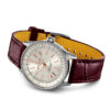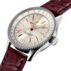 Breitling Navitimer Automatic 35 watch, 35mm, polished stainless steel case, Reference A17395F41G1P1. This model has Silver dial with a fine sunray finish and Tachymeter scale on dial flange. Polished luminous Rose gold-tone hour and minute hands with Red-tipped seconds hand, applied 18k Rose Gold index hour markers. On the outer edge of the dial, there is a Navitimer scale with minutes and seconds in small print. Stainless steel Pull / push non screw-locked crown with a two gaskets and logo Breitling. The dial closed by a Cambered sapphire crystal, glareproofed both sides. The screwed solid case back is made of Stainless Steel. The watch is equipped bidirectional rotating  beaded Stainless Steel bezel with slide rule. The watch is self-winding mechanical Breitling in-house caliber 17 contains 25 jewels and has an approximate power reserve of 38 hours. This model presented on a Straight Burgundy Alligator Leather strap with a Stainless Steel Tang-type Buckle Clasp. The water resistance is up to 30m/100ft.Â