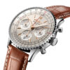 Breitling Navitimer B01 Chronograph. Silver Dial 41 mm Stainless Steel case. Bidirectional, slide rule bezel. Cambered sapphire, glareproofed both sides crystal. Breitling 01 calibre, Self-winding mechanical, 70 hours power reserve, 47 jewels. Alligator Leather strap Folding clasp. Water resistance 30 m