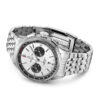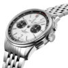 Unworn Breitling Men’s Watch Premier B01 Chronograph 42, Stainless steel case, brushed and polished finished, Reference AB0118221G1A1. This model has Silver ‘Panda’ dial effect is created by black sub-dials. There is a black flange with a tachometer scale along the contour of the dial. It also features overhead hour markers with luminous fill. The silver tone polished stainless steel hour and minute hands with luminous indicate the time; the seconds hand has a red tip. Fine printed minute/seconds & fractions of a seconds track around the outer rim. The watch has a polished stainless steel Pull/push crown without screwing down with two spacers. Its ribbed edge provides a comfortable grip. The Breitling logo is applied to the end of the crown. On the right side case also houses the Stainless Steel rectangular chronograph buttons. The dial closed by a Cambered Scratch-resistant Sapphire Crystal with glare-proofed both sides. Of Sapphire Crystal made transparent case back sapphire. A distinctive feature of this watch model namely elegant detail such as grooves on the side of the case. Black small seconds-hand sub-dial located at the 9 o’clock position. Date window at 6 o’clock. Chronograph functions: Column wheel mechanism; Central seconds counter hand; 30-minutes counter sub-dial located at the 3 o’clock position. The watch is equipped fixed silver-tone Stainless Steel bezel. The watch is Breitling in-house caliber B01, contains 41 jewels and has an approximate power reserve of 70 hours. The watch presented on a polished seven-row Stainless Steel bracelet, and Folding Clasp with Safety Latch. The water resistance is up to 100m/330ft.