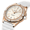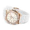 Unworn watch Breitling Super Chronomat Automatic 38 Origins, polished Small scale traceable 18k Red Gold case, reference R17356531G1S1, harmoniously combine precision engineering and timeless elegance. Crafted with meticulous attention to detail, they feature a sleek 38mm Small scale traceable 18k Red Gold case that combines stylish and durability. Cream dial with is decorated with a Small scale traceable 18k Red Gold «B» emblem below the 12 o’clock position and Small scale traceable 18k Red Gold polished hour markers and hands that glow in the dark thanks to luminescent filling. They are harmoniously complemented by a thin Small scale traceable 18k Red Gold second’s hand of a special design, which has a hand with luminescent filling and the manufacturer’s logo “B” on the other side. Date window located at the 6 o’clock position. The dial closed by a convex sapphire crystal, glareproofed both sides. A screw-on, durable Small scale traceable 18k Red Gold case back securely covers the watch mechanism. Small scale traceable 18k Red Gold crown with a white ceramic grip dome shape allows for easy adjustments. On end there is Breitling logo is applied. The watch features a polished Small scale traceable 18k Red Gold unidirectional rotating bezel with a ratcheting mechanism, a large luminous dot at the origin, and raised 15-minute tabs featuring white ceramic inserts and is factory set with 32 lab-grown diamonds. The Model comes with Breitling Caliber 17 contains 25 Jewels and has an approximate power reserve of 38 hours. The watch presented on the Featuring Breitling’s iconic and comfortable White Rubber strap, which fastens on Small scale traceable 18k Red Gold Tang- type. The water resistance is up to 100m/330ft.