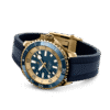 Unworn Breitling Watch Superocean Automatic 44, Bronze case, Reference N173761A1C1S1: a fusion of style and functionality, designed to accompany you on every underwater adventure and beyond. Crafted with precision engineering and unmistakable Breitling flair, this timepiece is not just a watch—it’s a companion for the explorers of the deep and the adventurers of life. The 44mm case is made from durable brushed and polished finished Bronze and provides the perfect balance of appearance and comfort on the wrist. Sporty, fresh and vibrant, this model features a matte Blue dial adorned with a Bronze “B†logo at 12 o’clock and large Bronze applied luminous hour markers. It features an impressive Bronze flange with a clearly readable minute scale, on which every 10 minutes are marked with large black Arabic numerals. The dial is decorated with polished Bronze hour and minute hands with luminous fill. An elegant Bronze central seconds hand with a luminous circle and a tip harmoniously complements them. The watch has a screw-locked screwing down crown of polished Bronze with two spacers. Its ribbed edge provides a comfortable grip. The Breitling logo is applied to the end of the crown. The dial closed by a convex sapphire crystal, glare-proofed both sides and solid Bronze case back. Unidirectional Bronze ratcheting bezel with ribbed edge, adorned with a polished Blue ceramic ring with luminous starting point and dive scale displays precise dive times. Breitling Caliber 17 contains 26 Jewels and has an approximate power reserve of 38 hours. The model is presented on Breitling’s iconic and comfortable a Blue Rubber strap, which fastens on Bronze Folding Clasp. The water resistance is up to 300m (1000ft).Â
