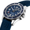 Sporty, fresh and colorful Breitling Superocean Automatic 44 watch, 44mm, Stainless Steel case, Reference A17367D81C1S1. This model has Matte Blue dial with applied large luminous index hour markers with lumincent fill and applied polished Large Arabic numerals mark the 6, 9, and 12 o’clock positions with lumincent fill. The dial is adorned polished grey hands, the hours and minute hands with luminous filled tips and Red-tipped seconds hand. Fine printed minute track on teh dial perimeter with Arabic numerals marking every 5-minute interval. The date displayed at the 3 o’clock position. Screw-locked crown with two gaskets and logo Breitling. The dial closed by a convex sapphire crystal, glare-proofed both sides and solid case back. The watch is equipped unidirectional rotating stainless steel bezel with a Matte Blue ring with engraved Arabic numerals and indexes. Breitling Caliber 17 contains 25 Jewels and has an approximate power reserve of 38 hours. The watch presented on a Blue Rubber Diver Pro III strap with Stainless Steel Tang Buckle Clasp. The water resistance is up to 1000m (3300ft).