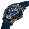 Breitling Superocean Automatic watch, 46mm, Black DLC stainless steel case. Blue dial with applied large luminous index hour markers and applied polished Large Arabic numerals mark the 6, 9, and 12 o’clock positions. Luminescent hour and minute hands. Minute markers around the outer rim. The date displayed at the 3 o’clock position. Screw-locked crown with two gaskets. The dial closed by a convex sapphire crystal, glare-proofed both sides. The Unidirectional DLC-Coated Stainless Steel bezel with a black metallic bezel insert. Breitling Caliber 17 contains 25 Jewels and has an approximate power reserve of 38 hours. The watch presented on a Diver Pro III Blue Rubber Strap with Tang Buckle Clasp. The water resistance is up to 2000m/6600ft.