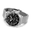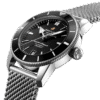 Breitling Superocean Heritage B20 Automatic 42 watch, polished stainless steel case 42mmm Reference AB2010121B1A1. The model has Black dial with a gold tone “B” Breitling emblem. This clock is bold  the iconic triangular-shaped large silver-tone different hands of polished steel with bold luminescent fill and applied polished stainless steel index hour markers with painted luminescent dot hour markers. Fine printed minute/seconds track with 15-minute Arabic numerals intervals on the outer perimeter. Date window located at the 6 o’clock position. The dial closed by a Cambered Scratch-resistant Sapphire Crystal with glare-proofed both sides. The watch has polished Stainless steel screw-locked crown with two gaskets. The crown has a ribbed edge for a comfortable grip and Breitling logo. They have solid screwed case back of Stainless steel. The watch is equipped Stainless Steel  unidirectional-ratcheted rotating fluted bezel with a black ceramic top ring with silver in the form of index markers and a triangle at the origin. The Model comes with Breitling Caliber B20, beats at 28’800 vph, contains 26 Jewels and has an approximate power reserve of 70 hours. The watch presented on the Mesh bracelet of Stainless Steel with Fold over clasp with a safety release. The water resistance is up to 200m/660ft.