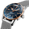 Breitling Superocean Heritage B20 Automatic watch 42mm, in polished stainless steel case, Reference UB2010161C1A1. This model has Scratch Resistant Sapphire Crystal, Blue dial with applied polished red gold index and painted luminous dot hour markers, polished red gold hands, the hour and minute hands with luminous fill. Printed minute/seconds track. Date window located at the 6 o’clock position. Â Pull / push crown, Unidirectional rotating 18kt rose gold bezel with a blue ceramic ring. The watch is Breitling caliber B20 contains 28 jewels and has an approximate power reserve of 70 hours. The watch presented on a polished Stainless Steel Mesh bracelet with Fold over clasp with a push button release. The water resistance is up to 100m/330ft (10ATM).