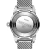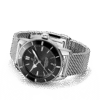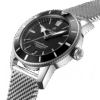 Breitling Superocean Heritage B20 Automatic 44 watch, polished stainless steel case 44mm, Reference AB2030121B1A1. The model has Black dial and is bold the iconic triangular-shaped large silver-tone different hands of polished steel with bold luminescent fill and applied polished stainless steel index hour markers with painted luminescent dot hour markers. Fine printed minute/seconds track with 15-minute Arabic numerals intervals on the outer perimeter. Date window located at the 6 o’clock position. The dial closed by a Cambered Scratch-resistant Sapphire Crystal with glare-proofed both sides. The watch has polished Stainless steel screw-locked crown with two gaskets. The crown has a ribbed edge for a comfortable grip and Breitling logo. They have solid screwed case back of Stainless steel. The watch is equipped Stainless Steel unidirectional-ratcheted rotating fluted bezel with a black ceramic top ring with silver in the form of index markers and a triangle at the origin. The Model comes with Breitling Caliber B20, beats at 28’800 vph, contains 26 Jewels and has an approximate power reserve of 70 hours. The watch presented on the Mesh bracelet of Stainless Steel with Fold over clasp with a safety release. The water resistance is up to 200m/660ft.