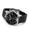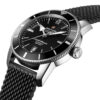 Breitling Superocean Heritage II watch, 46mm, polished stainless steel case. Black dial with a gold tone “B” emblem. Bold polished steel silver-tone hands with luminescent fill. Applied polished stainless steel index hour markers and painted luminescent dot hour markers. Printed minute/seconds track. Date window located at the 6 o’clock position. The dial protected by a scratch-resistant sapphire crystal. Screw down crown. Solid case back. Unidirectional rotating stainless steel bezel with a black ceramic top ring. The Watch comes with Breitling Caliber B20, beats at 28’800 vph, contains 26 Jewels and has an approximate power reserve of 70 hours. The watch presented on the Aero Classic strap of black rubber with Push Button Folding Clasp. The water resistance is up to 200m/660ft.