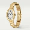Baignoire de Cartier watch, small model, quartz movement. Yellow gold 750/1000 case and beaded crown. Silvered dial, blued-steel sword-shaped hands, sapphire crystal. Yellow gold 750/1000 bracelet. Length: 31.4 mm, width: 23.09 mm, thickness: 6.95 mm. Water-resistant up to 3 bar (approx. 30 metres).