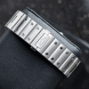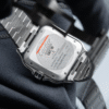 Santos watch, large model, mechanical movement with automatic winding, calibre 1847 MC. Steel case, 7-sided crown set with a faceted synthetic spinel, silvered opaline dial, steel sword-shaped hands, sapphire crystal. Steel bracelet with “SmartLink” adjustment system. Second bracelet in calfskin, with interchangeable steel folding buckle. Both bracelets are fitted with the “QuickSwitch” interchangeability system. Case width: 39.8 mm, thickness: 9.38 mm. Water-resistant to 10 bar (approx. 100 metres).