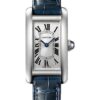 19 x 34.8 mm by 7 mm thick 18K white gold with rhodium finish case set with diamonds, octagonal in 18K white gold crown decorated with a diamond, mineral crystal, silver dial with Roman numerals and sword shaped blued-steel hands, caliber Cartier 157 quartz movement, 18K white gold in rhodium finish bracelet. Water resistant to 30 meters.
