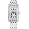 27mm x 15.2mm 18K white gold case set with brilliant-cut diamonds, 6.5mm thick, sapphire back, octagonal crown set with a brilliant-cut diamond, 18K white gold bezel set with a brilliant-cut diamonds, sapphire crystal, silver dial set with brilliant-cut diamonds, quartz movement with blued-steel sword-shaped hands, pink strap. Water resistant to 3 bar.