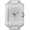 Medium size (39.2mm x 29.8mm) rhodiumized 18K white gold case set with brilliant-cut diamonds, nine-sided crown set with a brilliant-cut diamond, sapphire crystal, slivered and lacquered flinque dial with Roman numerals and sword-shaped blued-steel hands, self-winding caliber Cartier 077 movement, rhodiumized 18K white gold bracelet. Water resistant to 30 meters.