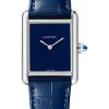 31 x 40.8 mm by 7.6 mm thick 18K pink gold and stainless steel case, 18K pink gold beaded crown set with a synthetic spinel cabochon, sapphire crystal, silver dial with 12 Roman numerals and blued steel hands, caliber Cartier 049 automatic movement, matt brown alligator strap with 18K pink gold buckle. Water resistant to 30 meters.