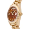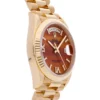 Pre-Owned Rolex Day-Date (128238) self - winding automatic watch, features a 36mm 18k yellow gold case surrounding a orange carnelian diamond dial on an 18k yellow gold President bracelet with folding buckle. Functions include hours, minutes, date and day. This watch comes complete with the original box and papers. Scattered Serial. Majority of time remaining on the factory warranty!