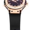 Hublot Big Bang Gold Diamonds 38mm watch, polished and satin-finished 18kt Rose Gold case, Reference 361.PX.1280.RX.1104. Case center (edge) lateral black composite resin inserts. This model has Solid black metallic black dial with a fine sunburst texture. Applied brushed finished 18kt Rose Gold “applique” style alternating Arabic Numerals and index hour markers. Brushed finished 18kt Rose Gold minute and hour hands with luminous filled tips and skeletonized bottoms. Printed minute track with 5-minute Arabic numerals intervals on flat black outer rim on the edge of the dial. 18kt Rose Gold Crown has a black rubber centers/inserts. The dial closed by a Scratch-resistant Sapphire Crystal with Anti-reflective Treatment. Solid 18K Rose Gold case back with logo Hublot. The watch is equipped fixed 18kt Rose Gold bezel set with 126 diamonds weighing +/- 0.87 carats, secured 6 immediately recognizable Hublots signature “H” screws style of Titanium. The watch is Hublot quartz/battery powered Caliber HUB 2900 with a validity period 3 to 5 Years. This model presented on a black Structured Lined Rubber Strap with 18K Rose Gold and Black-plated Stainless Steel Deployant Buckle Clasp. The water resistance is up to 100m/330ft (10 ATM).Â