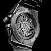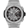 Hublot Big Bang Integral Titanium 42mm watch, Satin-finished titanium case with polished bevelled corners, Reference 451.NX.1170.NX. Case center (edge) lateral black composite resin inserts. This model has Matte Black Skeleton Dial with luminous silver-tone minute and hour hands with luminous filled tips and skeletonized bottoms. And also, the watch has applied index hour markers with luminous fill. Raised/tapered black inner bezel flange on the perimeter of the dial with red printed minute/seconds track and white printed 5 seconds increments in Arabic numerals. Date window with white background located at the 3 o’clock position. Small running seconds sub-dial hand located at the 9 o’clock position. Chronograph/Stopwatch functions: column wheel chronograph; features a “Flyback” function, which allows instant restarting of the chronograph with a single push of the button instead of the need to stop, reset and then restart the stop-watch; large central seconds counter; 60-minute counter sub-dial located at the 3 o’clock position. The chronograph is adjusted using Titanium rectangulars buttons. Screw-down Titanium crown with black rubber around for enhanced grip. The dial closed by a Scratch-resistant Sapphire Crystal with Anti-reflective Treatment. Of Sapphire Crystal made transparent case back. The watch is equipped fixed satin-finished and polished Titanium, secured 6 immediately recognizable Hublots signature “H” screws style of Titanium. The watch is HUB1280 UNICO Manufacture Self-winding Chronograph Flyback Movement with Column Wheel, contains 38 Jewels and has an approximate power reserve of 72 hours. This model presented on a Satin-finished and Polished Titanium Bracelet with Titanium Deployant Buckle Clasp. The water resistance is up to 100m/330ft (10 ATM).Â