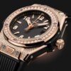 Unworn Hublot Big Bang ONE CLICK KING GOLD PAVÉ 485.OX.1180.RX.1604. 33 mm, Matte Black dial, Polished 18K King Gold Set with 130 Diamonds for 0.4ct case, Sapphire with Anti-reflective Treatment crystal, Polished 18K King Gold Set with 36 Diamonds for 0.76ct bezel, HUB1120 calibre, Self-winding Movement, 40hours power reserve, Black Structured Lined Rubber Straps with 18K King Gold and Black-plated Stainless Steel Deployant Buckle Clasp. Water resistant to 100 m.