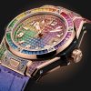 Unworn Hublot Big Bang ONE CLICK KING GOLD RAINBOW Ref# 485.OX.9900.LR.0999. 33 mm, Set with 232 Colored Gemstones dial, Polished 18K King Gold Set with 130 Colored Gemstones : Rubies, Pink Sapphires, Amethysts, Blue Sapphires, Blue Topazes, Tsavorites, Yellow and Orange Sapphires case, Sapphire with Anti-reflective Treatment crystal, Polished 18K King Gold Set with 42 Baguette-cut Colored Gemstones bezel, HUB1120 calibre, Self-winding Movement, 40hours power reserve, Black Rubber and Multicolored Alligator Leather Straps with 18K King Gold and Black-plated Stainless Steel Deployant Buckle Clasp. Water resistant to 100 m.