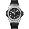 Hublot Big Bang One Click Steel Diamonds 33mm watch adopts the patented “One Click†fastening system, allowing the watch to take on an alternative appearance in just a click. Polished and Satin-finished Stainless Steel case, Reference 485.SX.1170.RX.1204. This model has Matte black dial with applied applique style alternating silver-tone Arabic numerals and index hour markers with luminous fill. Black dial flange with a silver-tone minute/seconds track. White Arabic numeral minute markers at 5-minute interval. Bold Silver-tone brushed finished hands with luminous fill (minutes and hours hands semi-skeleton). Date window located between the 3 o’clock positions. Screw-down Stainless Steel fluted crown for enhanced grip. The dial closed by a Scratch-resistant Sapphire Crystal with Anti-reflective Treatment. Of Sapphire Crystal made transparent case back. The watch is equipped fixed Stainless Steel bezel set with 36 diamonds for 0.76ct, secured 6 immediately recognizable Hublots signature “H” screws style of Titanium. The watch is Hublot in-house manufacture Caliber HUB1120 self-winding movement contains 25 Jewels and has an approximate power reserve of 42 hours. This model presented on a Black Structured Lined Rubber Strap with Stainless Steel Deployant Buckle Clasp. Straps are easily interchangeable via a unique quick-release push-button system developed by Hublot. The buttons are located on the top and bottom central lugs (this watch is delivered with a single strap only). The water resistance is up to 100m/330ft (10 ATM).