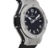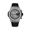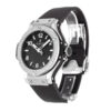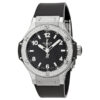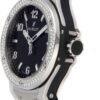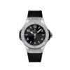 Hublot Big Bang, Steel, Black Diamonds, 38mm watch, Stainless Steel case with brushed and polished finishes, Reference 361.SX.1270.RX.1104. Case center (edge) lateral black composite resin inserts. This model has Solid black metallic dial with a fine sunburst texture. Applied brushed finished stainless steel “applique” style alternating Arabic Numerals and Index hour markers. Brushed finished stainless steel hands with luminous filled tips (minutes and hours hands semi-skeleton). Printed minute track with 5-minute Arabic numerals intervals on the outer perimeter of the dial. Stainless steel Push / pull crown has a black rubber center/insert with the Hublot logo. The dial closed by a Scratch-resistant Sapphire Crystal with Anti-reflective Treatment. The watch is equipped fixed Stainless steel bezel set with 126 diamonds weighing +/- 0.87 carats with immediately recognizable “H” style screws. The watch is Hublot quartz/battery powered Caliber HUB 2900, contains 7 Jewels and has an approximate power reserve of 3-5 years. This model presented on a Black Lined Rubber Strap with Stainless Steel Deployant Buckle Clasp. The water resistance is up to 100m/330ft (10 ATM).