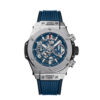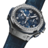Hublot Big Bang, Steel Blue Diamonds, 41mm watch, Stainless steel case with brushed and polished finishes, Reference 341.SX.7170.LR.1204. Case center (edge) with lateral blue inserts. This model has Blue Sunray Satin-finished dial. Applied brushed finished steel “applique” style Index hour markers with luminous fill. White printed minute track with 5-minute Arabic numerals intervals on flat black rim on the outer edge of the dial. Brushed finished stainless steel hands with luminous filled tips (minutes and hours hands semi-skeleton). Small running seconds sub-dial hand located at the 9 o’clock position. Date window located between the 4 and 5 o’clock position. Stainless steel crown and chronograph buttons fitted with black rubber centers/inserts. Crown with function Push/pull. The dial closed by a Scratch-resistant Sapphire Crystal with Anti-reflective Treatment. Of Sapphire Crystal made transparent case back. Chronograph stopwatch functions: large central seconds counter with the “H” logo as a counter-weight; 30-minute sub-dial counter located at the 3 o’clock position; 12-hour sub-dial counter located at the 6 o’clock position. The watch is equipped brushed finished stainless steel bezel set with 36 brilliant cut diamonds (aprox. 1.31 carats), secured 6 immediately recognizable Hublots signature “H” screws style of Titanium. The watch is Hublot Caliber HUB 4300 automatic movement, contains 28 Jewels and has an approximate power reserve of 42 hours. This model presented on a Blue Rubber and Alligator Leather Straps with Stainless Steel Deployant Buckle Clasp. The water resistance is up to 100m/330ft (10 ATM).