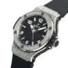 Hublot Big Bang, Steel Pave 38mm watch, Stainless steel case with brushed and polished finishes, set with 194 diamonds weighing +/- 0.82 carats, Reference 361.SX.1270.RX.1704. Case center (edge) lateral black composite resin inserts. This model has matte black dial with a fine sunburst texture. Applied brushed finished stainless steel “applique” style Arabic Numeral and Index hour markers. Printed minute track with 5-minute Arabic numerals intervals on flat black outer rim on the edge of the dial. Brushed finished stainless steel hands with luminous filled tips (minutes and hours hands semi-skeleton). The dial closed by a Scratch-resistant Sapphire Crystal with Anti-reflective Treatment. Stainless steel crown has a black rubber centers/inserts. Of Stainless steel made solid case back. The watch is equipped fixed Stainless steel bezel set with 126 diamonds weighing +/- 0.87 carats, secured 6 immediately recognizable Hublots signature “H” screws style of Titanium. The watch is Hublot Caliber HUB2900 Quartz Movement and has an approximate power reserve of 3 – 5 Years. This model presented on a Black Lined Rubber Strap with Stainless Steel Deployant Buckle Clasp. The water resistance is up to 100m/330ft (10 ATM).